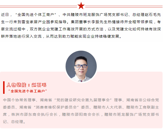 圍繞發展抓黨建,抓好黨建促發展!正是基于趙石毛先生種種緊跟黨走的切實舉措,中共醴陵市班龍服飾廣場支部委員會先后被省市縣三級非公綜合黨委表彰為“先進基層組織”,讓趙石毛先生及其企業的黨建文化建設名聲在外!2019年5月起,赴全國六大片區深入企業、學校、政府有關部門公益宣講“黨建引領,創新發展”,至今共計112場。