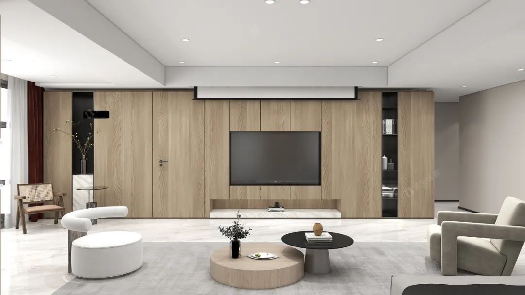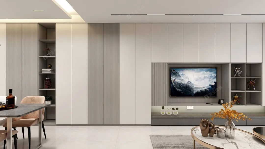 整墻電視柜,墻柜一體,外表簡約時尚,自然素雅,無拉手設(shè)計讓整個柜體更為利落清爽。