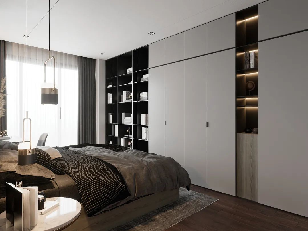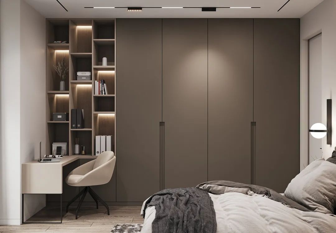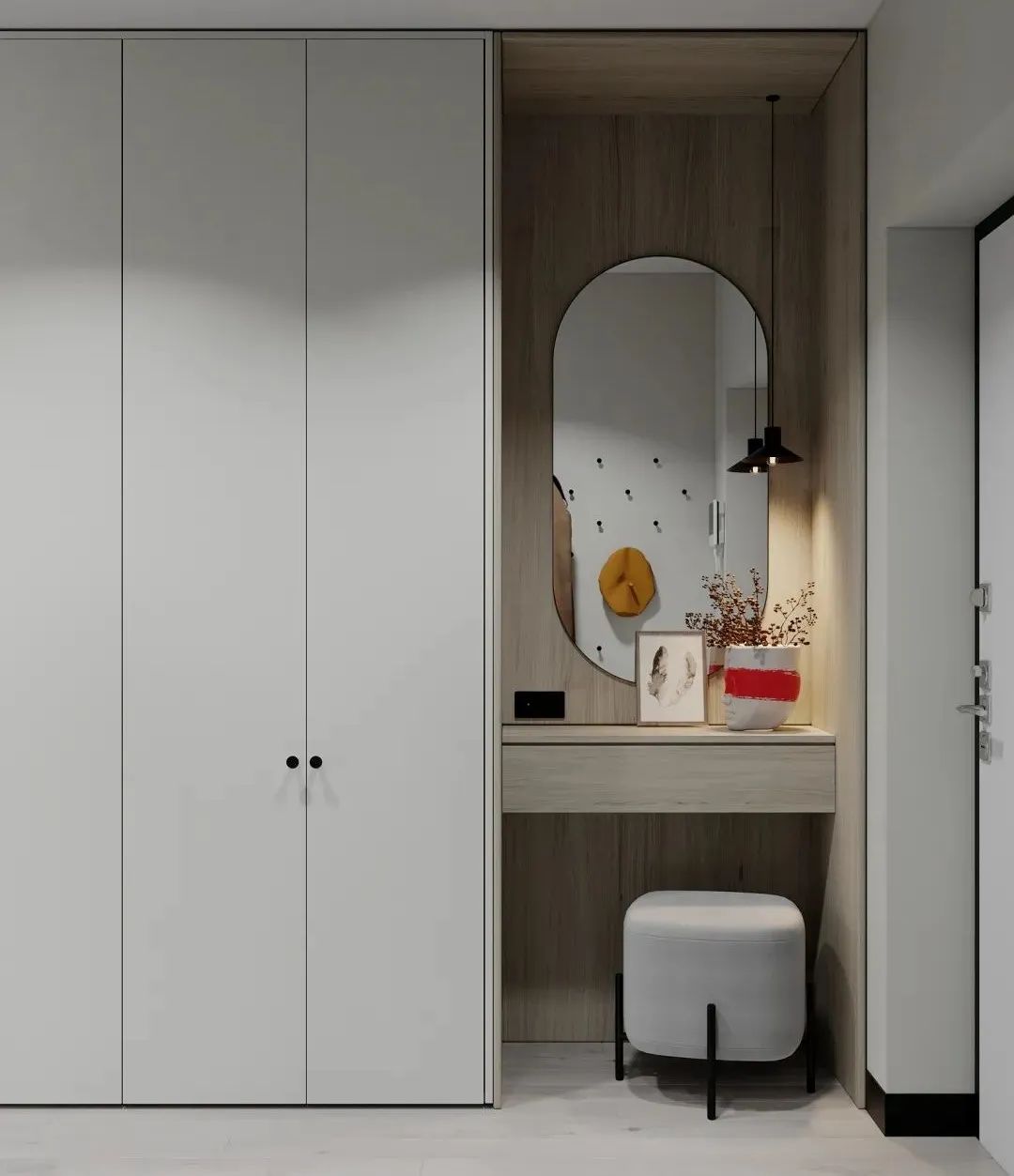 超高柜門,顧名思義,就是柜門做高,它也有另外一個叫法叫做通頂柜門。超高柜門一般都是一塊板從上貫到下,整體流暢,干凈利落。極簡自然的氣質,就是它倍受歡迎的原因。大多數超高柜門都是運用在極簡風格、輕奢風格的空間設計中,可以做無把手,或者豎長把手,或者橫短把手,給人整體美觀、簡潔自然的感覺。