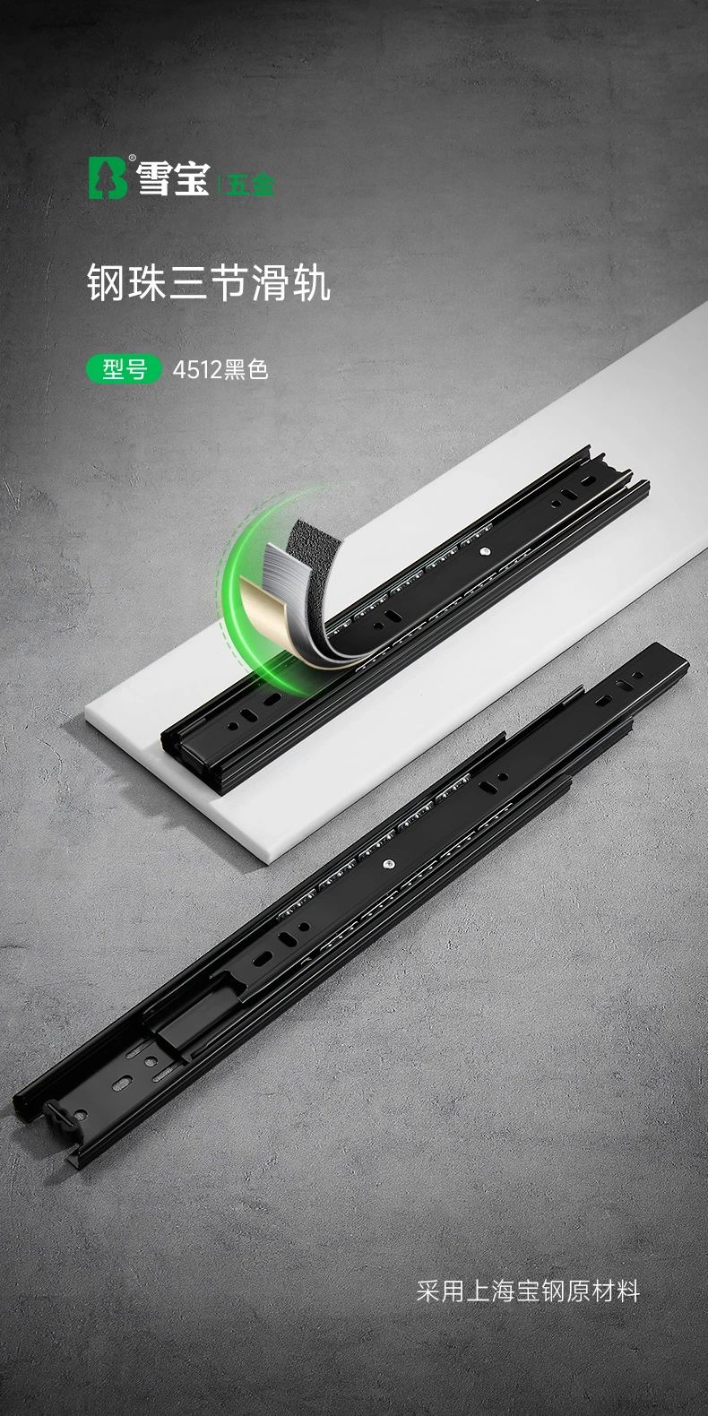 雪寶五金4512黑色鋼珠三節(jié)滑軌