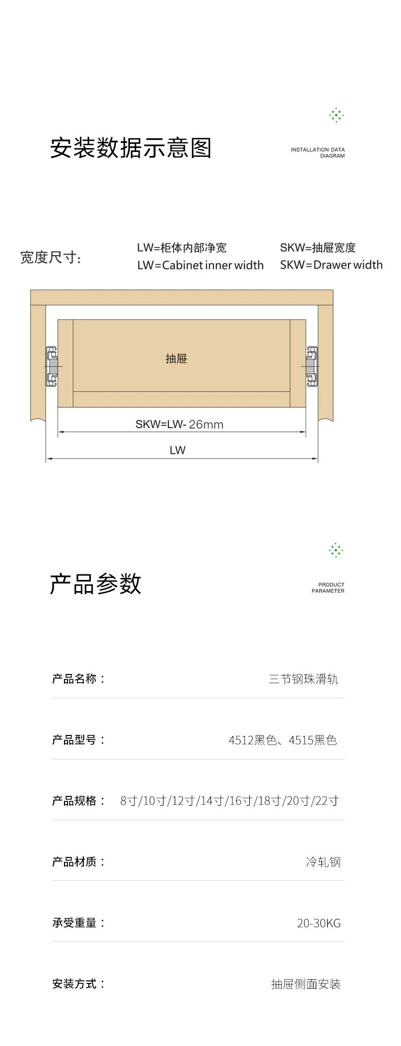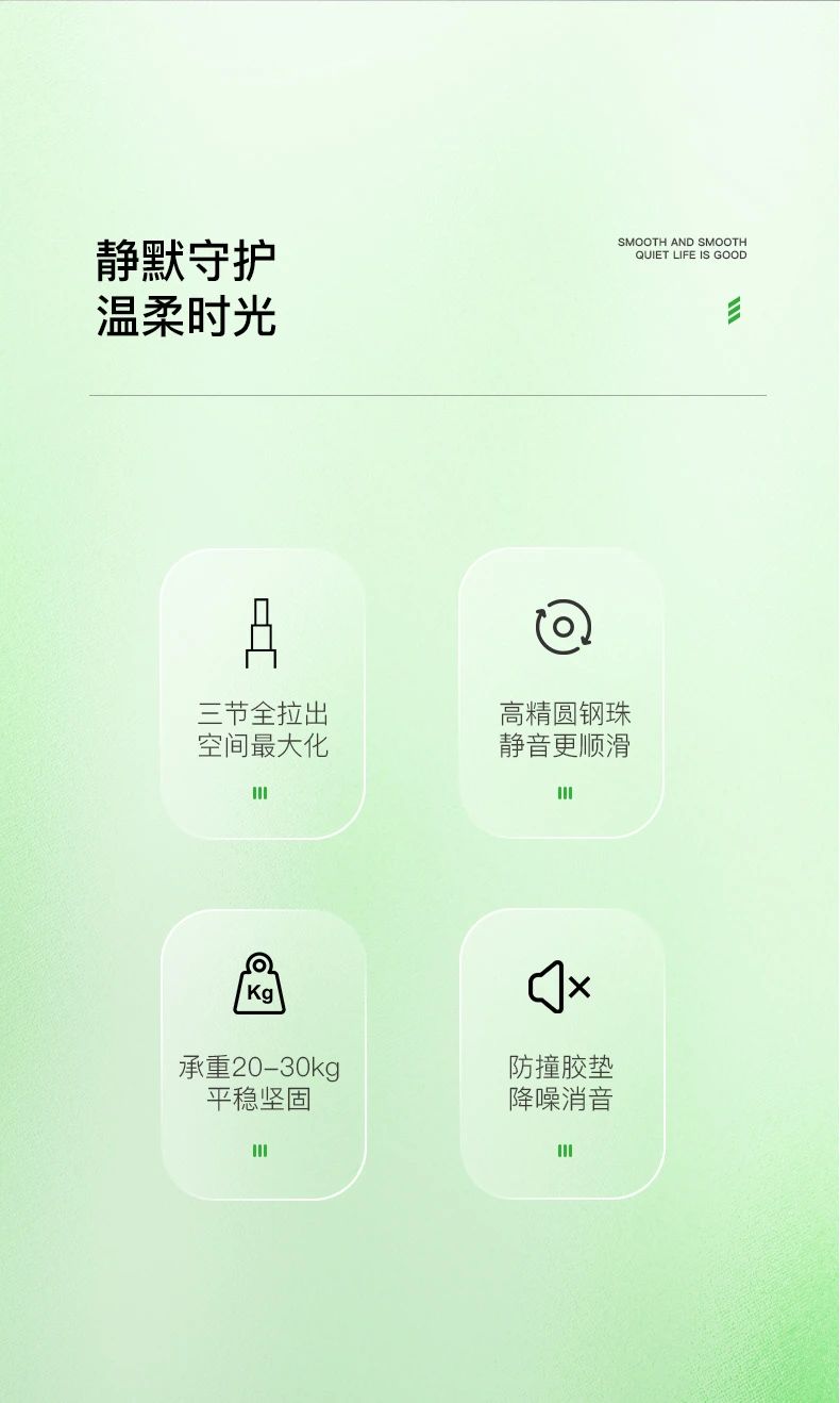 1、上海寶鋼原材料,高光封閉電鍍,抗銹能力極強(qiáng);2、加厚三節(jié)鋼珠抽屜滑軌,標(biāo)準(zhǔn)厚度,經(jīng)久耐用;3、進(jìn)口高精圓鋼珠,平穩(wěn)、順暢,開合更靜音;4、三節(jié)軌全拉出,抽屜一覽無余,空間最大化;5、承重30kg,平穩(wěn)堅(jiān)固;6、防撞膠墊,降噪消音;