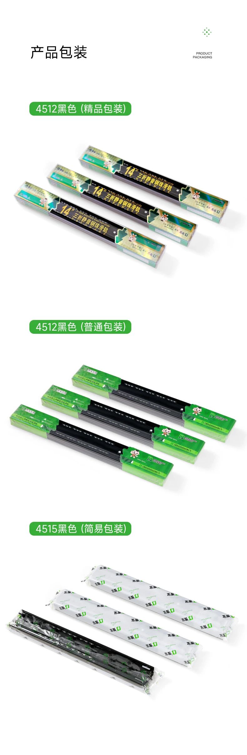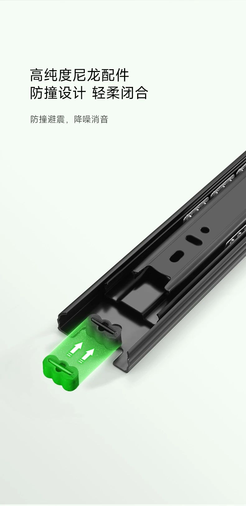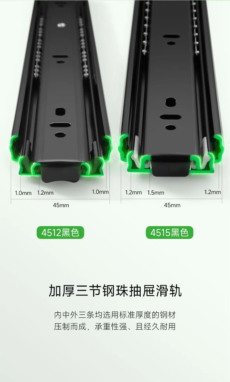 抽屜在家具中的使用很關(guān)鍵,對于抽屜而言,滑軌就是抽屜的“心臟”。于家居收納中有著無與倫比的作用,讓空間在無序中建立有序。而抽屜的使用體驗(yàn),絕大程度上取決于滑軌。開合是否能順滑、能抽拉到什么程度、承重如何、會不會翻傾等問題,都跟滑軌有關(guān)系,因此選擇一個品質(zhì)好的滑軌很重要。雪寶4512黑色鋼珠三節(jié)滑軌,精工設(shè)計(jì),內(nèi)置鋼珠,穩(wěn)定性強(qiáng),全程順滑到底。三節(jié)全拉出設(shè)計(jì),抽屜空間一覽無余,物品收納整齊有序,取物更輕松。表面電鍍工藝,抗腐蝕,耐磨損,久用如新,無需頻繁更換。苛求品質(zhì)細(xì)節(jié),讓每一次推拉都是一種享受!
