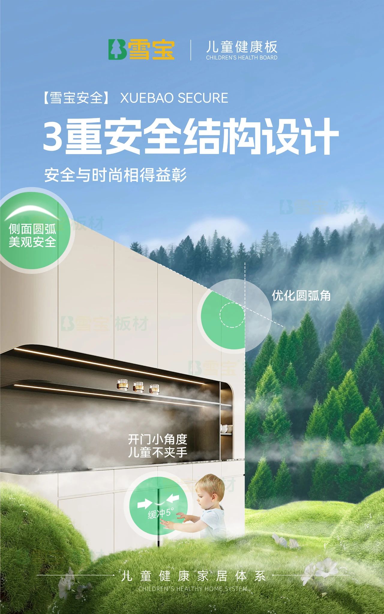 采用雪寶3重安全門柜設計,一重圓弧式安全設計,柜體邊緣及尖端進行圓滑處理;二重開合防擠壓設計,應用高性能緩沖五金件,避免玩耍時的擠壓;三重突出物保護設計,減少柜體拉手、螺絲的露出,增加隱形內拉手、二合一隱形安裝工藝等,在減少孩子每一個磕碰可能的同時,還呈現(xiàn)出時尚極簡的線條美感。