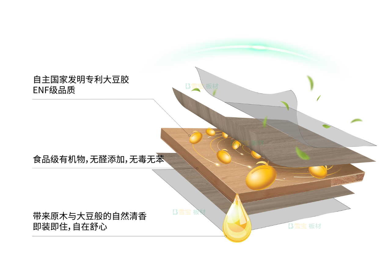使用自主擁有的國家發明專利大豆膠(利用純天然、可再生的豆粕為原料,精萃大豆活性蛋白,濃縮為性能優異的生物質大豆膠)進行黏合,0醛添加,環保等級達到新國標ENF級,無需擔心甲醛釋放問題,且具有卓越的耐水性、粘結性,品質穩定,是您打造家居空間的放心之選。