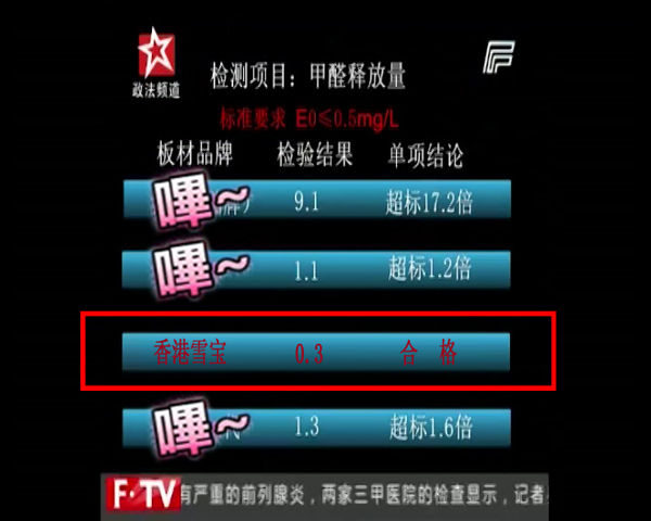 政法頻道3.15期間特別節(jié)目《陽(yáng)光下的315》中,記者暗訪了某大型建材市場(chǎng)中的各板材專賣店,也抽取了其中某些品牌產(chǎn)品進(jìn)行甲醛釋放量檢測(cè),其中雪寶E0級(jí)別的板材也被隨機(jī)抽查,與其它品牌板材一起接受了檢驗(yàn)。