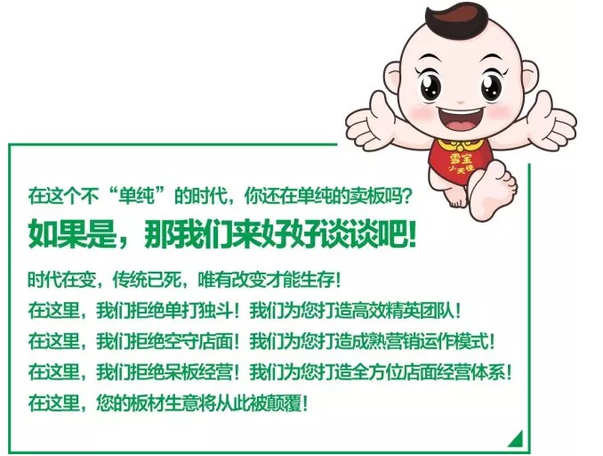 ♣經過多年的發展和變革,雪寶品牌已形成了涵蓋:潮流家具、新穎移門、環保生態板、智芯板、細木工板、膠合板、飾面板、石膏板、五金、乳膠、涂料、線條、地板等風格多樣化的多類別產品。持續帶給廣大消費者最優品質、最佳服務及最具性價比產品選擇,是雪寶品牌持續永恒的動力源泉。