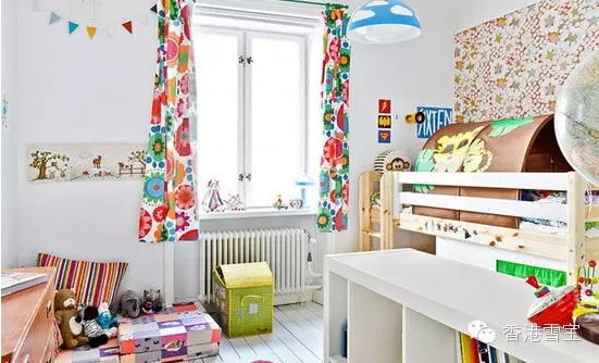 充滿童趣主題的兒童臥室,有趣的弧線形床罩讓睡覺也變得十分有意思,花樣色彩絢麗的窗簾和墻紙遙相呼應。