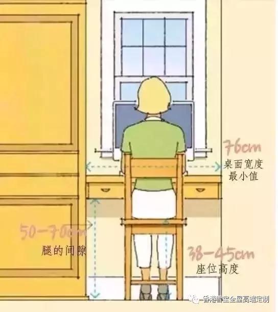 ①腿的間隙是50~70cm,座位的高度是38cm~45cm,桌面寬度最小值是76cm。