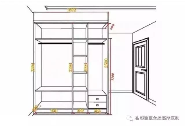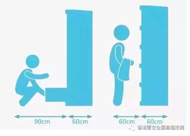 關于衣柜預留位置,還需要注意的是,普通衣柜的進深一般為60cm,結合柜門與抽屜打開時的尺寸考慮,需要給衣柜前方預留60cm-90cm的空間。